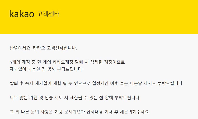 이에 대한 카카오 고객센터 대답 메일입니다. 총 계정 개수가 5개까지 계정을 자유롭게 삭제 재가입이 가능하다는 것으로 볼 수 있습니다.