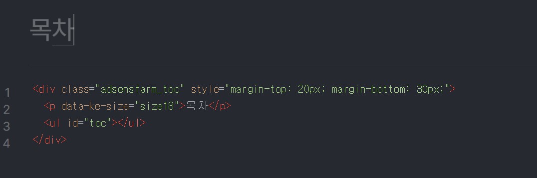 서식을 작성할 때는 HTML 모드로 변경후 본문에 코드를 넣고 저장합니다. 그래야 서식에 대한 코드가 적용이 되어 목차가 만들어집니다.